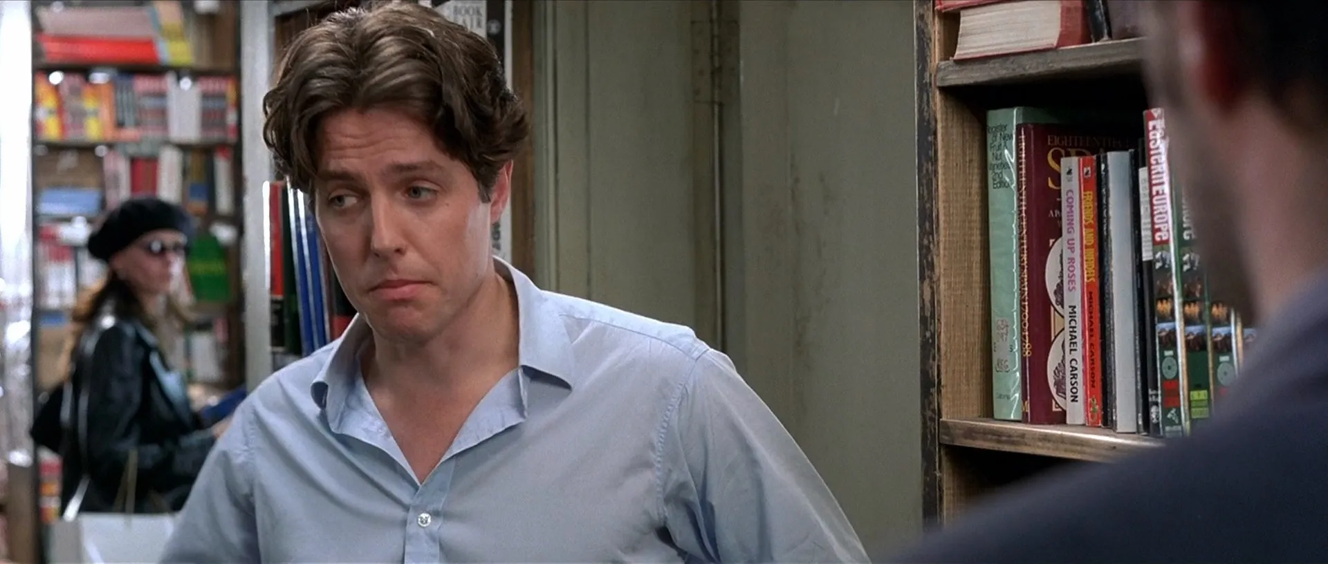 Actors: Julia Roberts as Anna Scott, Hugh Grant as William Thacker, Gina McKee as Bella, Tim McInnerny as Max, Rhys Ifans as Spike, Emma Chambers as Honey, Hugh Bonneville as Bernie, Richard McCabe as Tony, James Dreyfus as Martin, Dylan Moran as Rufus the Thief, Roger Frost as Annoying Customer, Henry Goodman as Ritz Concierge, Julian Rhind-Tutt as 'Time Out' Journalist, Lorelei King as Anna's Publicist, John Shrapnel as PR Chief, Emily Mortimer as Perfect Girl, Dorian Lough as Loud Man in Restaurant, Sanjeev Bhaskar as Loud Man in Restaurant, Paul Chahidi as Loud Man in Restaurant, Matthew Whittle as Loud Man in Restaurant, Mischa Barton as 12-year-old Actress, Clarke Peters as 'Helix' Lead Actor, Ann Beach as William's Mother, Samuel West as Anna's Co-Star, Tony Armatrading as Security Man, Andy de la Tour as Journalist, Rupert Procter as Journalist, Maureen Hibbert as Journalist, David Sternberg as Journalist, Arturo Venegas as Foreign Actor, Phillip Manikum as Harry the Sound Man, Patrick Barlow as Savoy Concierge, Yolanda Vazquez as Interpreter, Melissa Wilson as Tessa, Emma Bernard as Keziah, September Buckley as Third Assistant Director, Dennis Matsuki as Japanese Businessman, Alec Baldwin as Jeff King (uncredited), Simon Callow as Simon Callow (uncredited), Omid Djalili as Coffee Shop Cashier (uncredited), Matthew Modine as Actor (uncredited), Taylor Murphy as Journalist (uncredited)