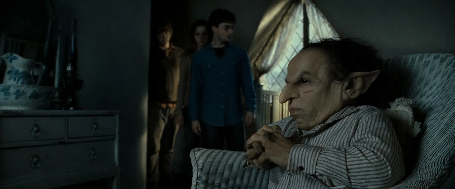 Actors: Daniel Radcliffe as Harry Potter, Rupert Grint as Ron Weasley, Emma Watson as Hermione Granger, Ralph Fiennes as Lord Voldemort, Alan Rickman as Severus Snape, Helena Bonham Carter as Bellatrix Lestrange, Maggie Smith as Minerva McGonagall, Michael Gambon as Albus Dumbledore, John Hurt as Ollivander, Tom Felton as Draco Malfoy, Warwick Davis as Griphook / Filius Flitwick, Robbie Coltrane as Rubeus Hagrid, Jason Isaacs as Lucius Malfoy, Kelly Macdonald as Helena Ravenclaw, Gary Oldman as Sirius Black, David Thewlis as Remus Lupin, David Bradley as Argus Filch, Ciarán Hinds as Aberforth Dumbledore, Gemma Jones as Poppy Pomfrey, Dave Legeno as Fenrir Greyback, Miriam Margolyes as Pomona Sprout, Helen McCrory as Narcissa Malfoy, Nick Moran as Scabior, James Phelps as Fred Weasley, Oliver Phelps as George Weasley, Clémence Poésy as Fleur Delacour, Natalia Tena as Nymphadora Tonks, Julie Walters as Molly Weasley, Mark Williams as Arthur Weasley, Bonnie Wright as Ginny Weasley, Evanna Lynch as Luna Lovegood, Domhnall Gleeson as Bill Weasley, Graham Duff as Death Eater, Anthony Allgood as Gringotts Guard, Rusty Goffe as Aged Gringotts Goblin, Jon Key as Bogrod, Ian Peck as Hogsmeade Death Eater, Benn Northover as Hogsmeade Death Eater, Hebe Beardsall as Ariana Dumbledore, Matthew Lewis as Neville Longbottom, Devon Murray as Seamus Finnigan, Jessie Cave as Lavender Brown, Afshan Azad as Padma Patil, Isabella Laughland as Leanne, Anna Shaffer as Romilda Vane, Georgina Leonidas as Katie Bell, Freddie Stroma as Cormac McLaggen, Alfred Enoch as Dean Thomas, Katie Leung as Cho Chang, William Melling as Nigel Wolpert, Sian Grace Phillips as Screaming Girl, Ralph Ineson as Amycus Carrow, Suzie Toase as Alecto Carrow, Jim Broadbent as Horace Slughorn, Scarlett Hefner as Pansy Parkinson, Josh Herdman as Gregory Goyle, Louis Cordice as Blaise Zabini, Amber Evans as Twin Girl 1, Ruby Evans as Twin Girl 2, George Harris as Kingsley Shacklebolt, Chris Rankin as Percy Weasley, Guy Henry as Pius Thicknesse, Phil Wright as Giant, Gary Sayer as Giant, Tony Adkins as Giant, Penelope McGhie as Death Eater, Emma Thompson as Sybill Trelawney, Ellie Darcey-Alden as Young Lily Potter, Ariella Paradise as Young Petunia Dursley, Benedict Clarke as Young Severus Snape, Leslie Phillips as The Sorting Hat (voice), Alfie McIlwain as Young James Potter, Rohan Gotobed as Young Sirius Black, Geraldine Somerville as Lily Potter, Adrian Rawlins as James Potter, Toby Papworth as Baby Harry Potter, Timothy Spall as Peter Pettigrew, Peter G. Reed as Death Eater, Judith Sharp as Death Eater, Emil Hostina as Death Eater, Bob Yves Van Hellenberg Hubar as Death Eater, Granville Saxton as Death Eater, Tony Kirwood as Death Eater, Ashley McGuire as Death Eater, Arthur Bowen as Albus Severus Potter (19 Years Later), Daphne de Beistegui as Lily Luna Potter (19 Years Later), Will Dunn as James Sirius Potter (19 Years Later), Jade Gordon as Astoria Malfoy (19 Years Later), Bertie Gilbert as Scorpius Malfoy (19 Years Later), Helena Barlow as Rose Weasley (19 Years Later), Ryan Turner as Hugo Weasley (19 Years Later), Paul Bailey as Gryffindor Student (uncredited), Sean Biggerstaff as Oliver Wood (uncredited), Vinnie Clarke as Gryffindor Student (uncredited), David Heyman as Dining Wizard in Painting (uncredited), Charlie Hobbs as Student (uncredited), Luke Newberry as Teddy Lupin (uncredited), Keijo J. Salmela as Gringotts Goblin (uncredited), Pauline Stone as Nurse Wainscott (uncredited), Spencer Wilding as Knight of Hogwarts (uncredited), Harrison Davis as Gringotts Goblin (uncredited), Annabelle Davis as Gringotts Goblin (uncredited)