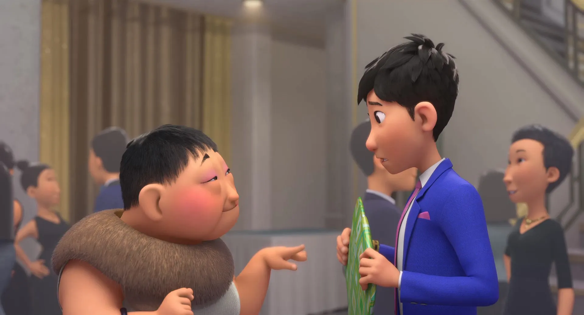 Actors: Jimmy Wong as Din (voice), John Cho as Long (voice), Constance Wu as Mom (voice), Natasha Liu Bordizzo as Lina (voice), Jimmy O. Yang as Short Goon / Security Guard 2 (voice), Aaron Yoo as Pockets (voice), Will Yun Lee as Dad (voice), Bobby Lee as Tall Goon (voice), Nico Santos as Buckley (voice), Ronny Chieng as Pipa God (voice), Ian Chen as Young Din (voice), Sumalee Montano as Granny Neighbor / Cougar / Party Guest (voice), David So as Construction Worker / Neighbor (voice), Gustav Lindquist as Security Guard 1 & 3 / School Bully (voice), Alexandre Chen as Various characters (voice), Alyssa Abiera as Young Li Na (voice), Gabriel Lee as Wen / DJ / K-Drama Man (voice), Chris Appelhans as Hot Towel Waiter / Nomani Retailer (voice), Rad Sechrist as Maitre D' / Additional Waiter (voice), Cathy Cavadini as Additional Voices (voice), Levi Nunez as Additional Voices (voice), Nora Wyman as Additional Voices (voice), Jeremy Maxwell as Additional Voices (voice), Lee Chen as Additional Voices (voice), James Taku Leung as Additional Voices (voice), Constance Parng as Additional Voices (voice), Malana Lea as Additional Voices (voice), Victor Chi as Additional Voices (voice), Elizabeth Pan as Additional Voices (voice), Paul Kwo as Additional Voices (voice), Kathy Wu as Additional Voices (voice), Wilky Lau as Additional Voices (voice), Willow Geer as Additional Voices (voice), Will Collyer as Additional Voices (voice), Regina Taufen as Additional Voices (voice), David Arnott as Additional Voices (voice), Simon Twu as Additional Voices (voice)